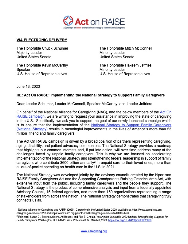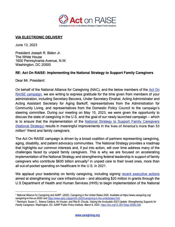 This week Act On RAISE campaign sent letters to the White House and congressional leadership outlining the campaign’s requests to drive implementation of the Nation Strategy to Support Family Caregivers. The letters include signatures from 43 organizations, both the nonprofit and private sector, representing constituencies from across the United States. As a community dedicated to lifting the voices of family caregivers, we stand ready to support the immediate and longer-term efforts of the Biden-Harris Administration and Congress to strengthen the bond of caregiving that connects American families and communities. Please see the letters below for more information about the Act On RAISE campaign’s goals.
